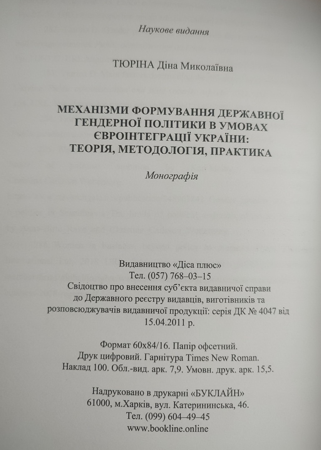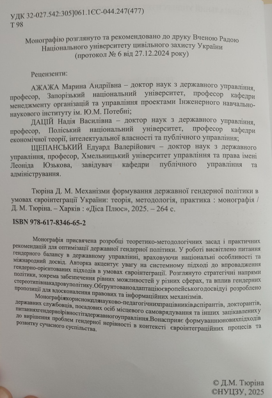| Короткий огляд (реферат): | Монографія присвячена розробці теоретико-методологічних засад і практичних рекомендацій для оптимізації державної гендерної політики. У роботі висвітлено питання гендерного балансу в державному управлінні, враховуючи національні особливості та міжнародний досвід. Авторка акцентує увагу на системному підході до впровадження гендерно-орієнтованих підходів в умовах євроінтеграції. Розглянуто стратегічні напрями політики, зокрема забезпечення рівних можливостей у різних сферах, та вплив гендерних стереотипів на кадрову політику. Обґрунтовано адаптацію європейського досвіду і розроблено пропозиції для вдосконалення правових та інформаційних механізмів. Монографія є корисною для науково-педагогічних працівників, аспірантів, докторантів, державних службовців, посадових осіб місцевого самоврядування та інших зацікавлених у питаннях гендерної рівності та державного управління. Вона сприяє формуванню нових підходів до вирішення проблем гендерної нерівності в контексті євроінтеграційних процесів та розвитку сучасного суспільства. |