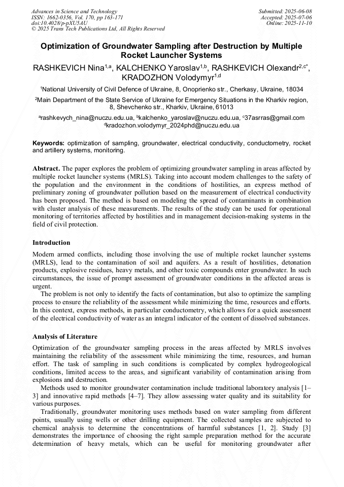 Короткий огляд (реферат): The paper explores the problem of optimizing groundwater sampling in areas affected by multiple rocket launcher systems (MRLS). Taking into account modern challenges to the safety of the population and the environment in the conditions of hostilities, an express method of preliminary zoning of groundwater pollution based on the measurement of electrical conductivity has been proposed. The method is based on modeling the spread of contaminants in combination with cluster analysis of these measurements. The results of the study can be used for operational monitoring of territories affected by hostilities and in management decision-making systems in the field of civil protection.