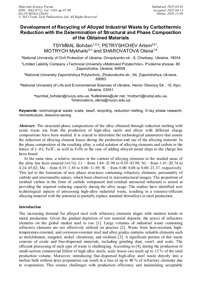http://repositsc.nuczu.edu.ua/handle/123456789/26230| Назва: | Development of Recy-cling of Alloyed Industri-al Waste by Carbothermic Reduction with the De-termination of Structural and Phase Composition of the Obtained Materials |