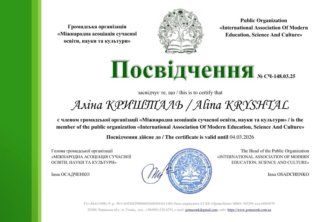 | Опис: | Член ГО «Міжнародна асоціація сучасної освіти, науки та культури» (свідоц. №СЧ-148.03.25) |