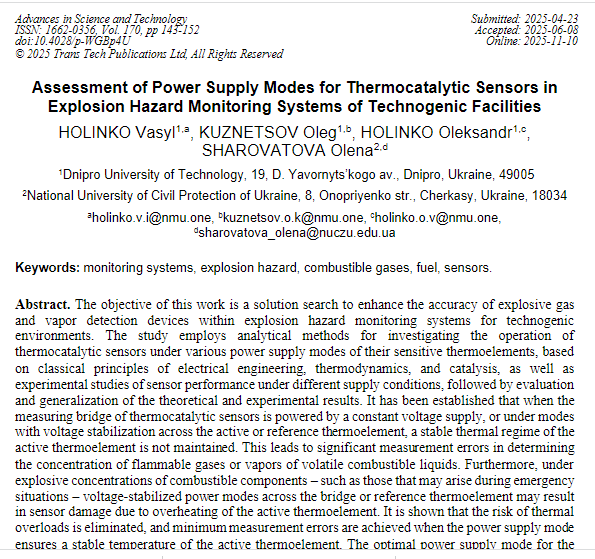 Короткий огляд (реферат): The objective of this work is a solution search to enhance the accuracy of explosive gas and vapor detection devices within explosion hazard monitoring systems for technogenic environments. The study employs analytical methods for investigating the operation of thermocatalytic sensors under various power supply modes of their sensitive thermoelements, based on classical principles of electrical engineering, thermodynamics, and catalysis, as well as experimental studies of sensor performance under different supply conditions, followed by evaluation and generalization of the theoretical and experimental results.